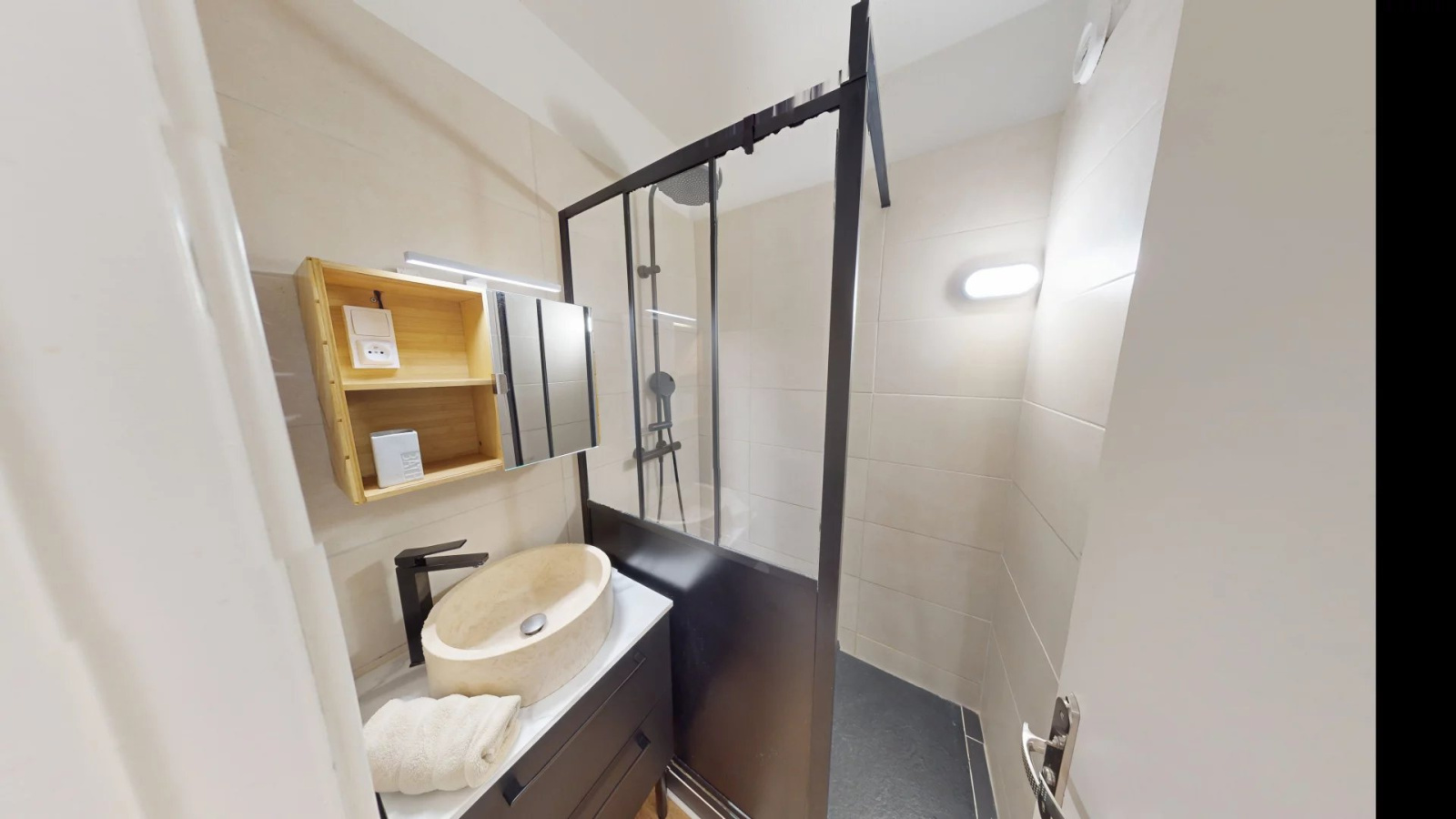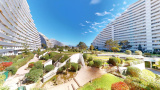 comprenant un hall d'entrée avec des placards, d'un WC séparé, d'une salle d'eau avec une douche à l'italiene et d'un séjour avec sa cuisine ouverte s'ouvrant sur une terrasse bénéficiant d'une belle vue dégagée sur le parc, la montagne et la mer.